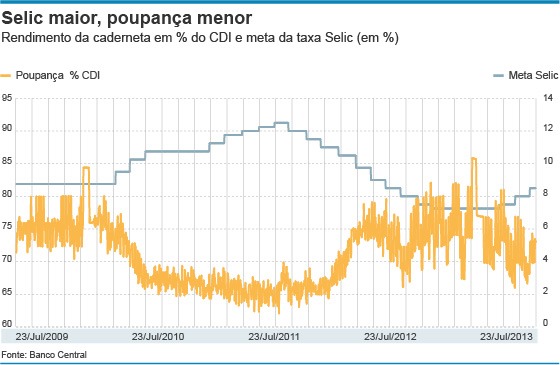 A rentabilidade da poupança girou em torno de 75% do CDI até maio de 2010, enquanto a Selic permanecia em 8,75% ao ano. A partir de então a remuneração da poupança começa a cair, atingindo o patamar inferior a 65% do CDI em meados de julho de 2010. No mesmo intervalo a Selic subiu, até chegar ao pico de 12,5% ao ano.