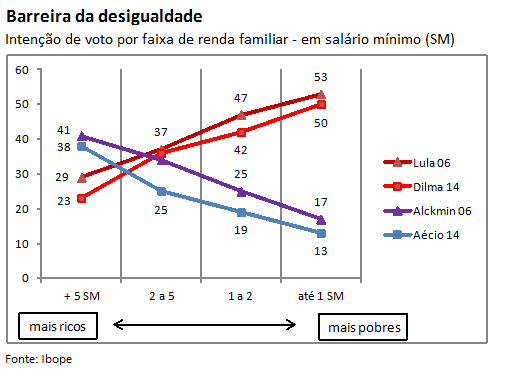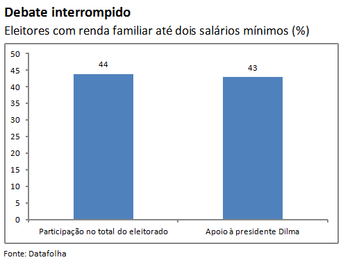 Segundo o Datafolha, 44% dos eleitores possuem renda familiar de até dois salários mínimos. Nesse grupo, o apoio à presidente Dilma é de 43%.