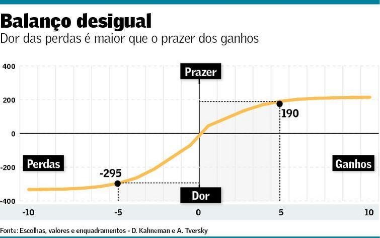 De forma geral, a dor da perda supera o prazer do ganho, o que induz ao conservadorismo. Mas em algumas situações, quando o prejuízo é iminente, a tentação natural é dobrar as apostas. O gráfico abaixo mostra como funcionam as decisões quando o assunto envolve perdas e ganhos.