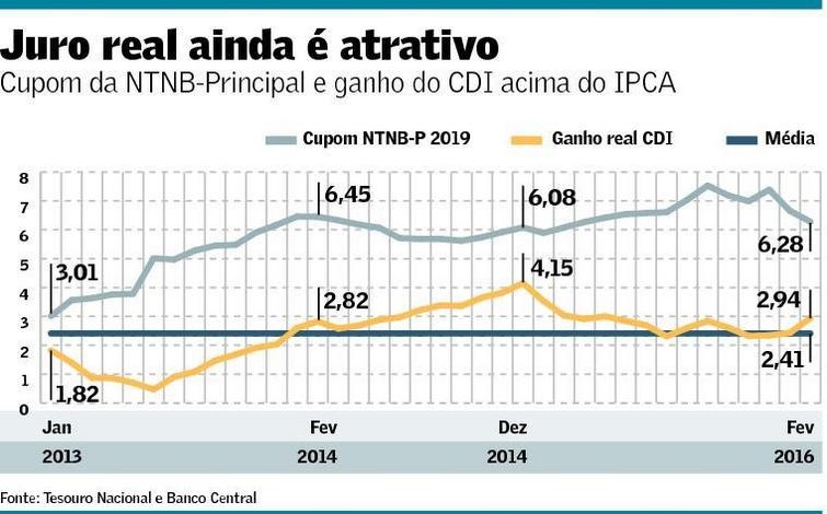 A linha horizontal azul escuro mostra o ganho médio real anualizado do CDI no período entre janeiro de 2013 e fevereiro de 2016, que ficou em 2,4% ao ano.