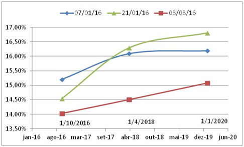 A linha azul claro mostra a evolução mensal do cupom da Nota do Tesouro Nacional da série B Principal (NTNB-P) com vencimento em maio de 2019 negociada no Tesouro Direto, o sistema de venda de títulos públicos via internet administrado pelo Tesouro Nacional.