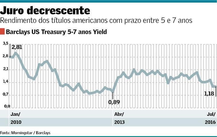 Por exemplo, em janeiro de 2014 o rendimento médio de um título do governo americano com prazo de vencimento variando entre cinco e sete anos era de 1,86% ao ano, segundo o índice Barclays US Treasury 5-7 anos Yield. Em julho de 2016 o rendimento para quem comprava o papel havia caído para 1,18% ao ano.