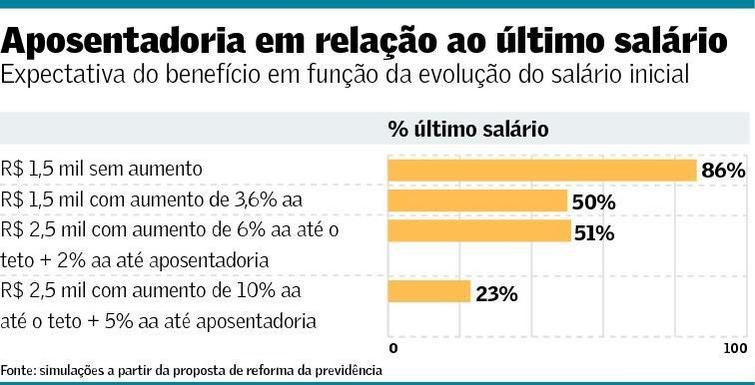 Pela proposta, se uma pessoa começasse a trabalhar hoje aos 30 anos, com rendimentos mensais de R$ 1,5 mil e contribuísse por 35 anos para o INSS, teria direito a aposentadoria de 86% do salário a partir dos 65 anos de idade. A premissa desta simulação é que não ocorrerão ganhos salariais reais – acima da inflação – durante toda a carreira.
