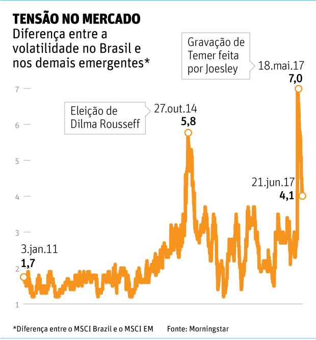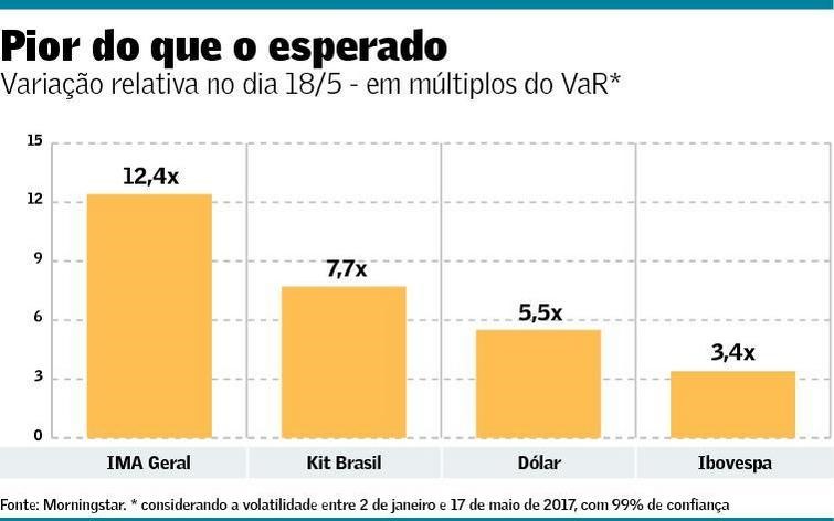 Considerando como referência o VaR de 1 dia, com 99% de confiança e a volatilidade registrada entre 2 de janeiro e 17 de maio de 2017, a queda do IMA Geral no dia 18 de maio foi 12,4 vezes superior ao que seria esperado. Pelos mesmos critérios, a desvalorização cambial foi 5,5 vezes maior e o prejuízo do Ibovespa foi 3,4 vezes acima do previsto.