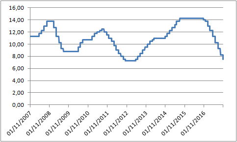 Nos últimos 10 anos, entre dezembro de 2007 e novembro de 2017, a taxa Selic oscilou entre a mínima de 7,25% ao ano até a máxima de 14,25% ao ano. No período entre julho de 2008 e maio de 2015, a variação acumulada do CDI em períodos de cinco anos foi menor que 10% ao ano, o atual patamar da taxa prefixada.