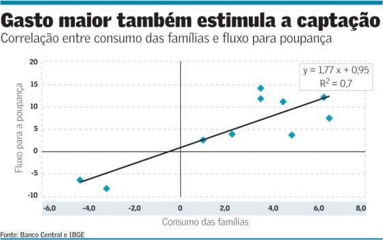 Analisando os dados anuais dos últimos dez anos, verifica-se que correlação entre o consumo das famílias e o fluxo de recursos para a poupança é igual a 0,7. A interpretação para esse fato é que quando a renda das famílias aumenta, uma parte vai para o consumo e outra para a caderneta de poupança.