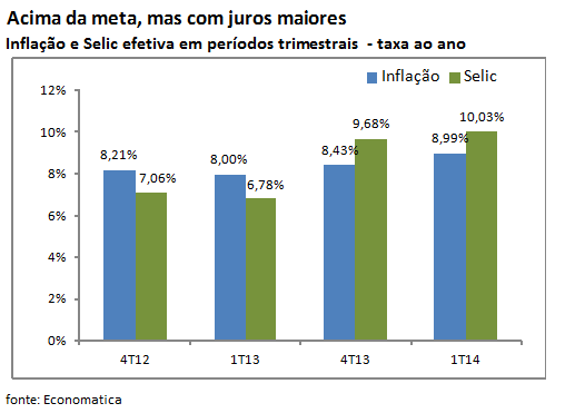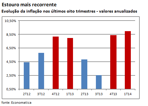A inflação superou o teto da meta de 6,5% ao ano em quatro dos últimos oito trimestres. É a primeira vez que isso ocorre desde 2005, quando o Banco Central passou a perseguir a taxa de 4,5% ao ano.