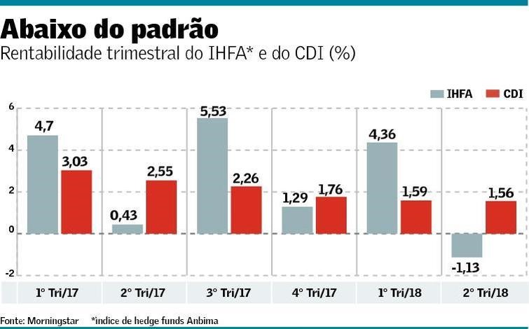 Mas os últimos três meses mostraram que não basta correr mais risco para obter maior retorno. Entre abril e junho deste ano, o desempenho do IHFA foi de -1,13%. Já o CDI subiu 1,56%.