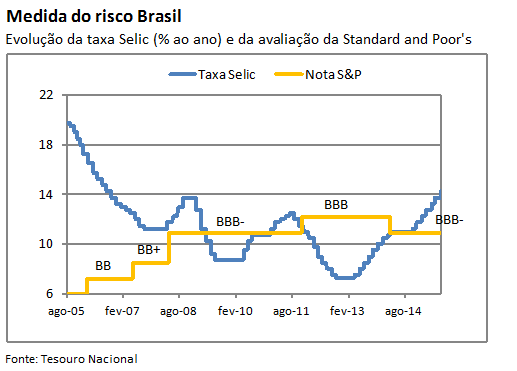 A nota atual do Brasil (BBB-) é o limite para o grau de investimento. Abaixo de BB+, o país é considerado como grau especulativo. Na última vez que a taxa básica de juros superou o patamar de 14,25% ao ano, a nota do Brasil era BB.